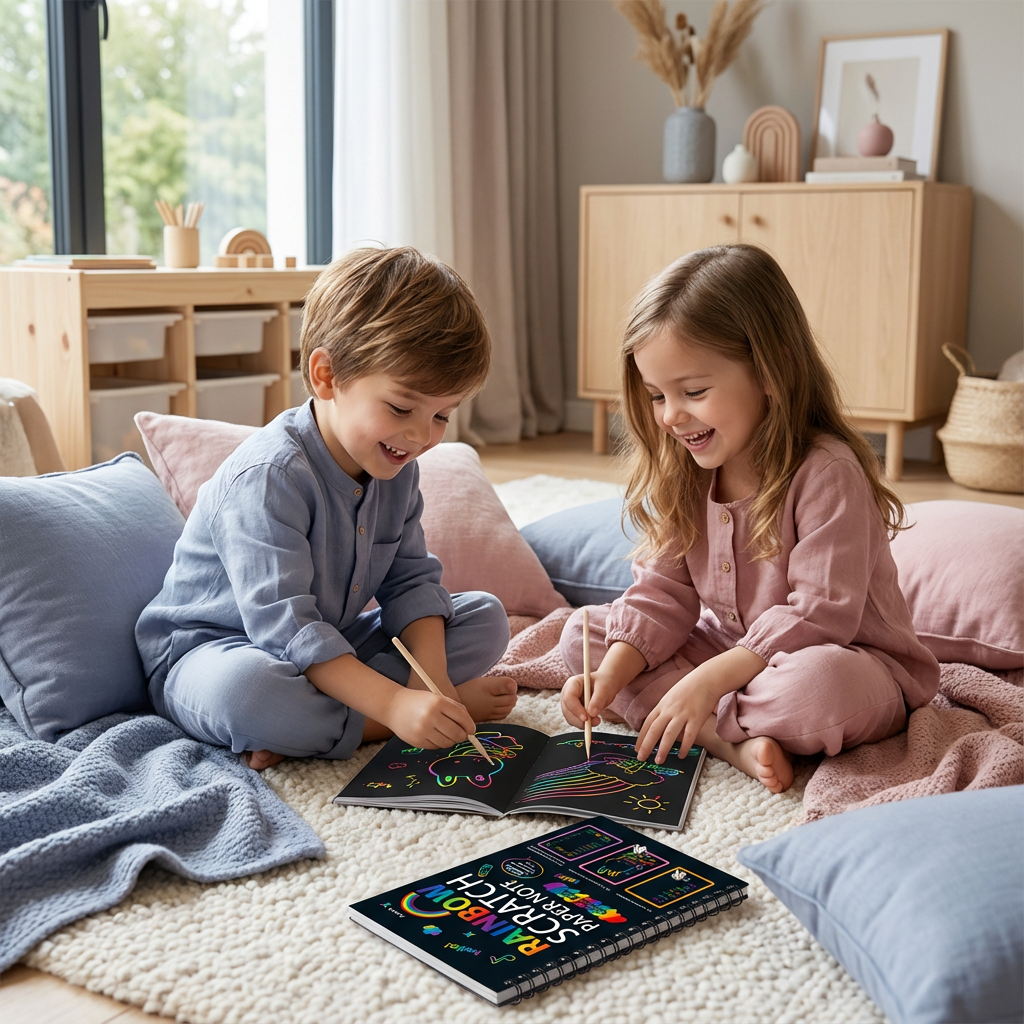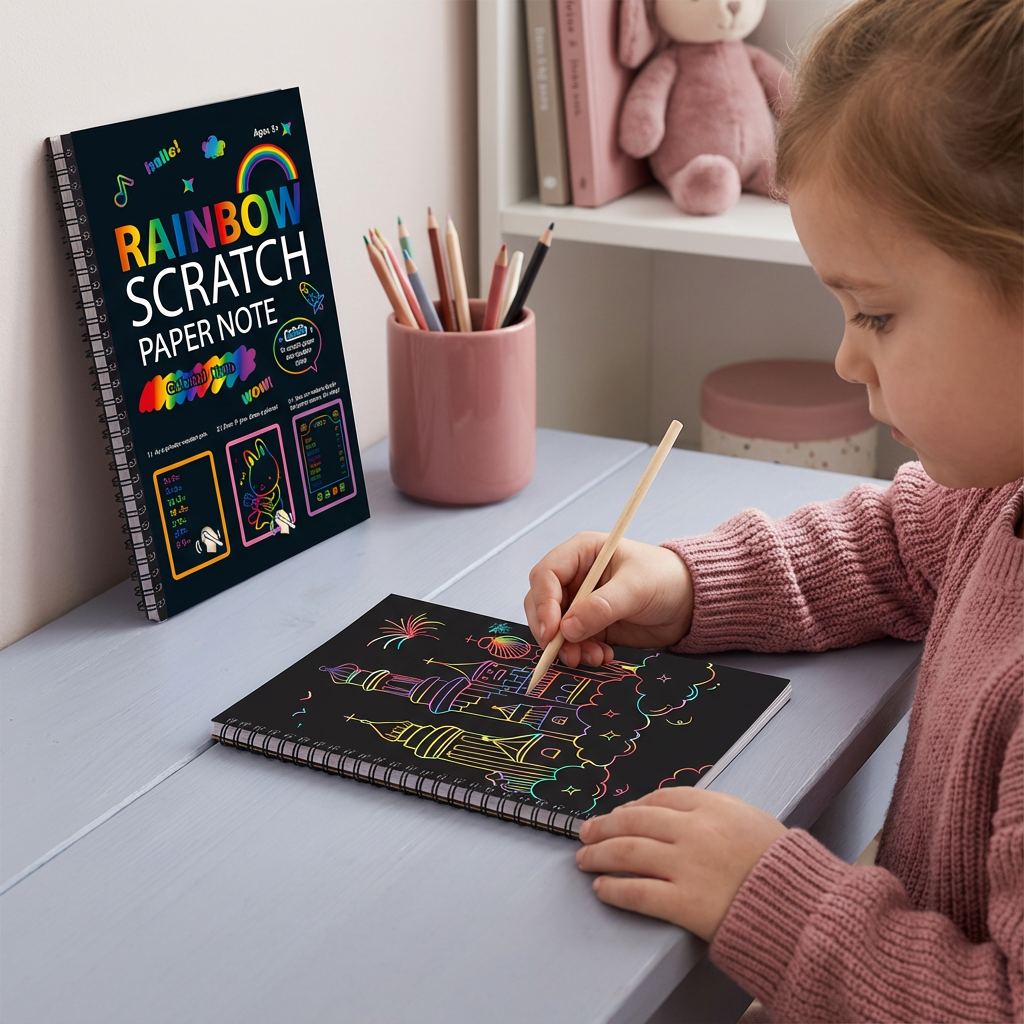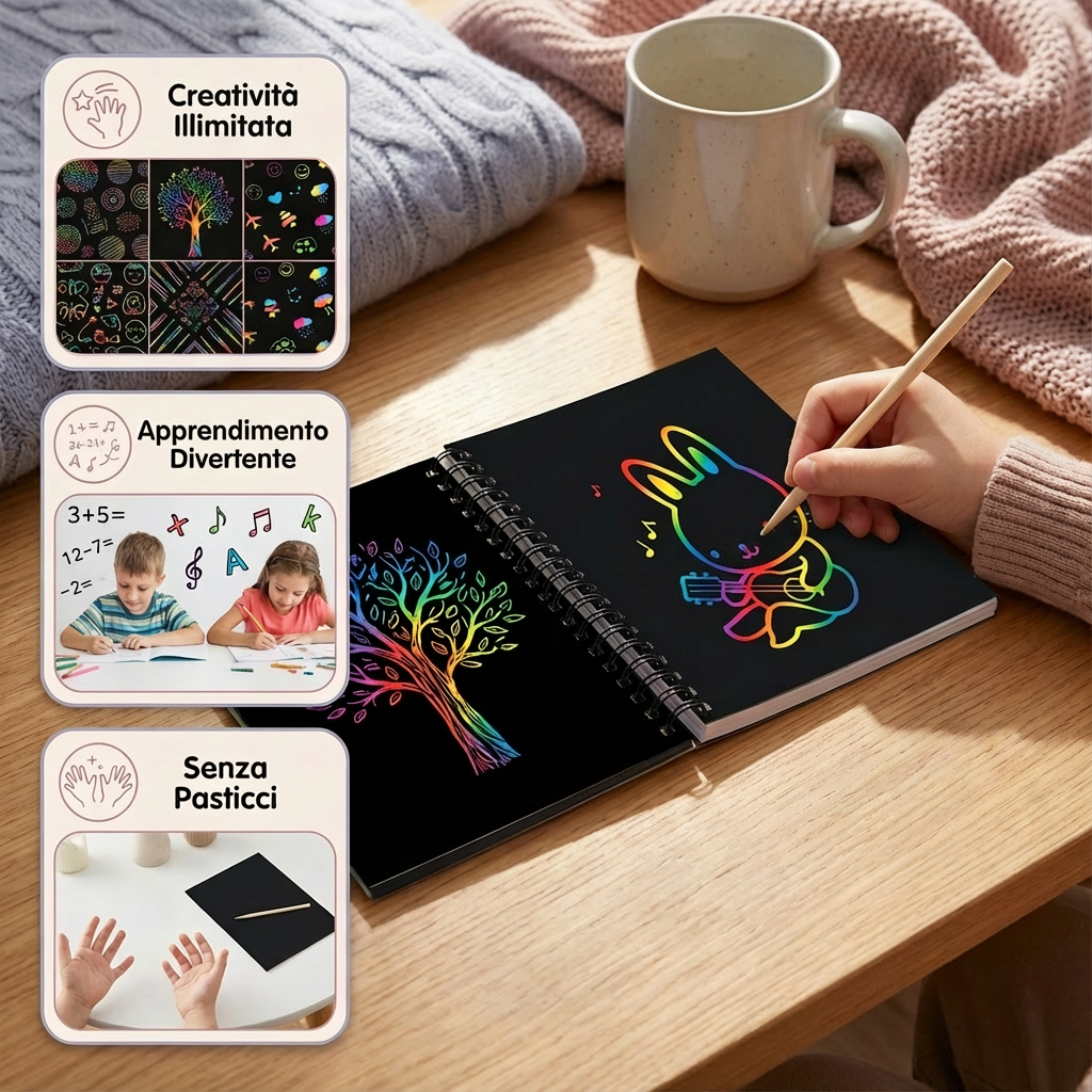 La Carta Magica da Grattare Arcobaleno trasforma ogni progetto creativo in un’esperienza colorata e sorprendente. Sotto la superficie nera si nasconde un brillante arcobaleno che appare a ogni graffio. Che sia per bambini, artisti o appassionati di fai-da-te, questo set stimola fantasia e concentrazione e regala ore di divertimento creativo e rilassante, senza caos né colori.