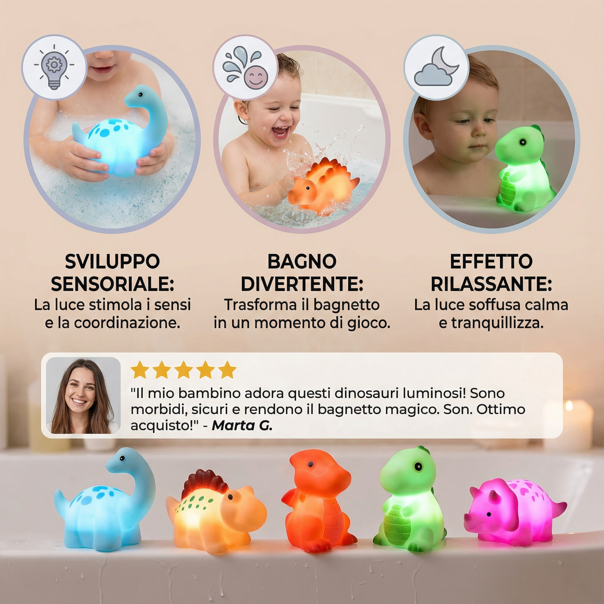 "Mio figlio adora questi dinosauri luminosi durante il bagno. Le luci creano un’atmosfera rilassante e rendono il momento molto più divertente. Ottima qualità e perfetti anche come luce notturna."