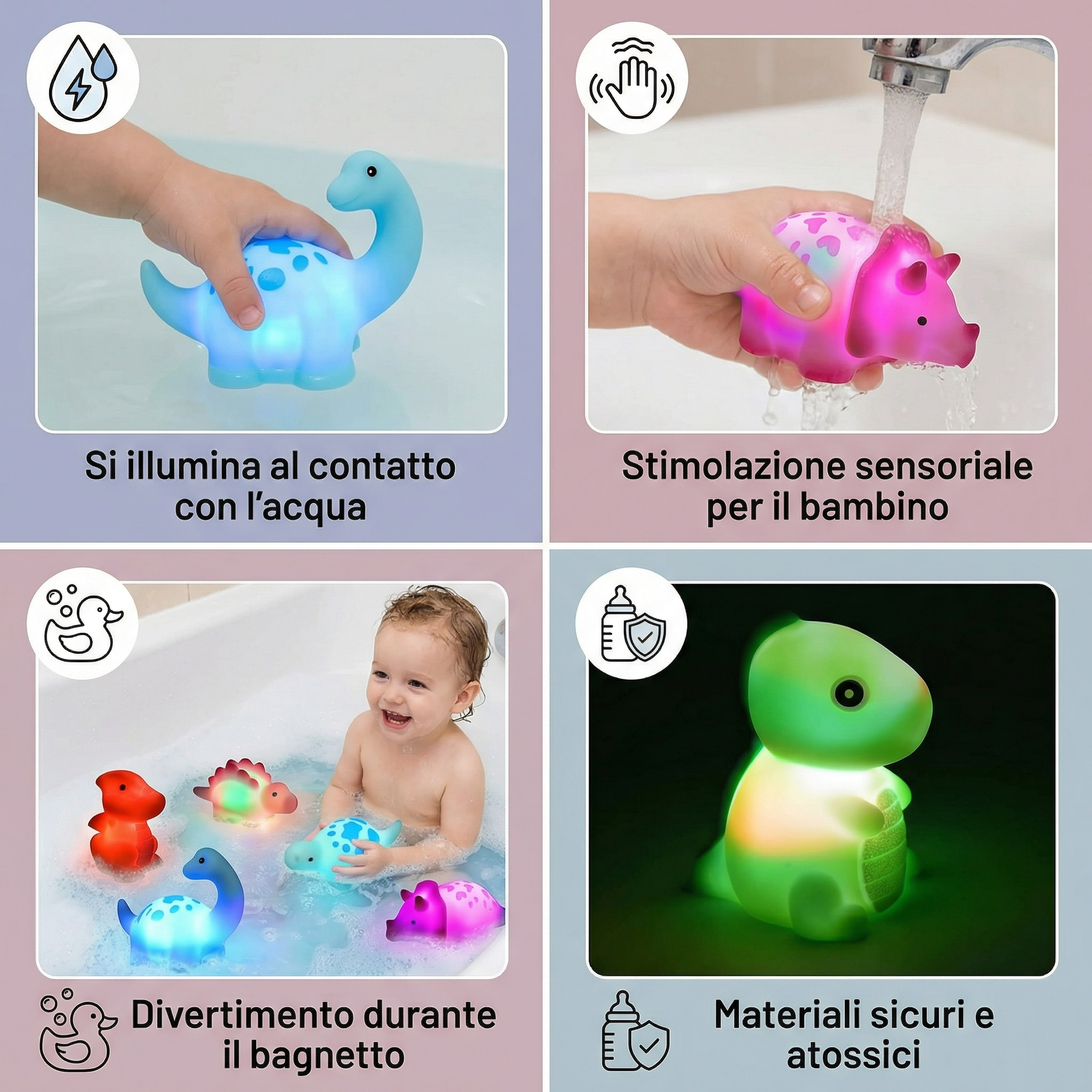 Porta un divertimento luminoso nella vasca da bagno! Questi adorabili dinosauri luminosi trasformano ogni bagno in un’avventura colorata.