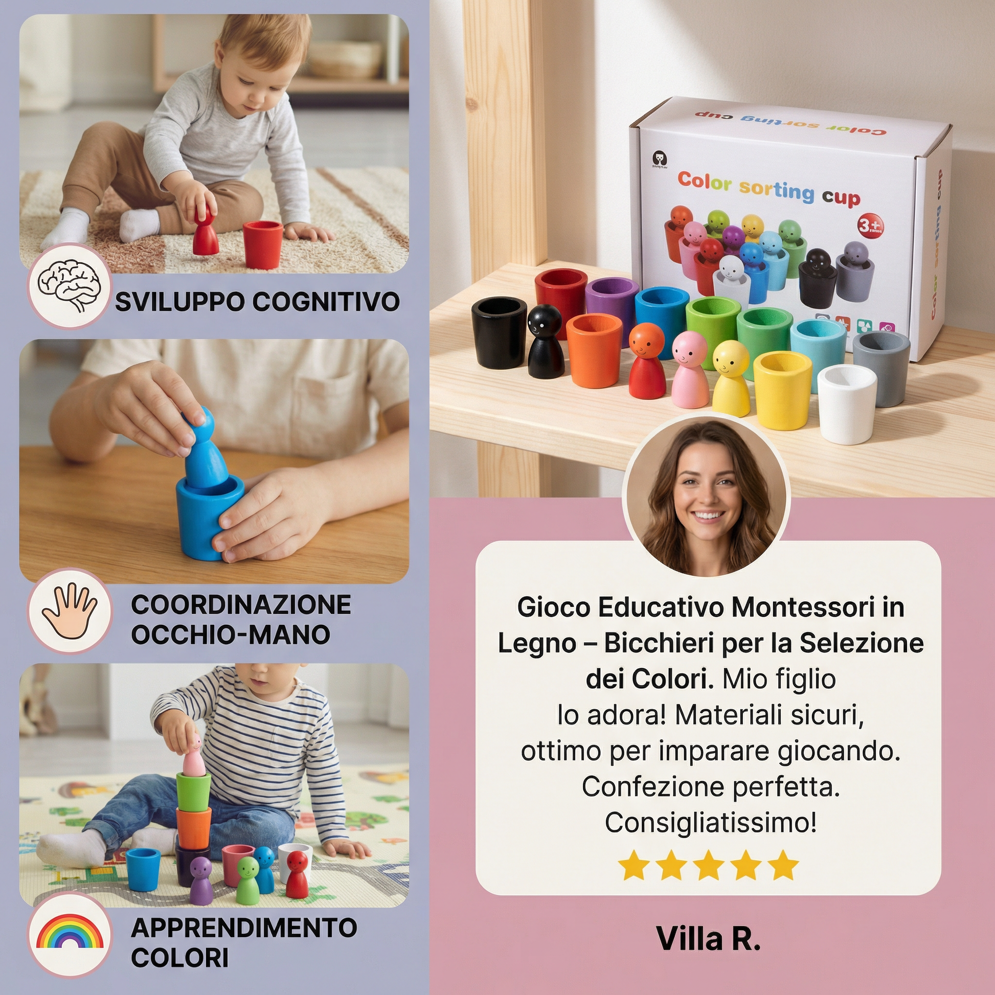 Questo gioco Montessori è ben realizzato e molto educativo. Mio figlio si diverte mentre impara a riconoscere i colori.