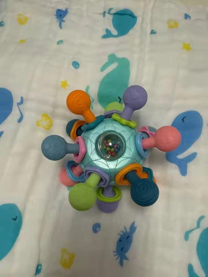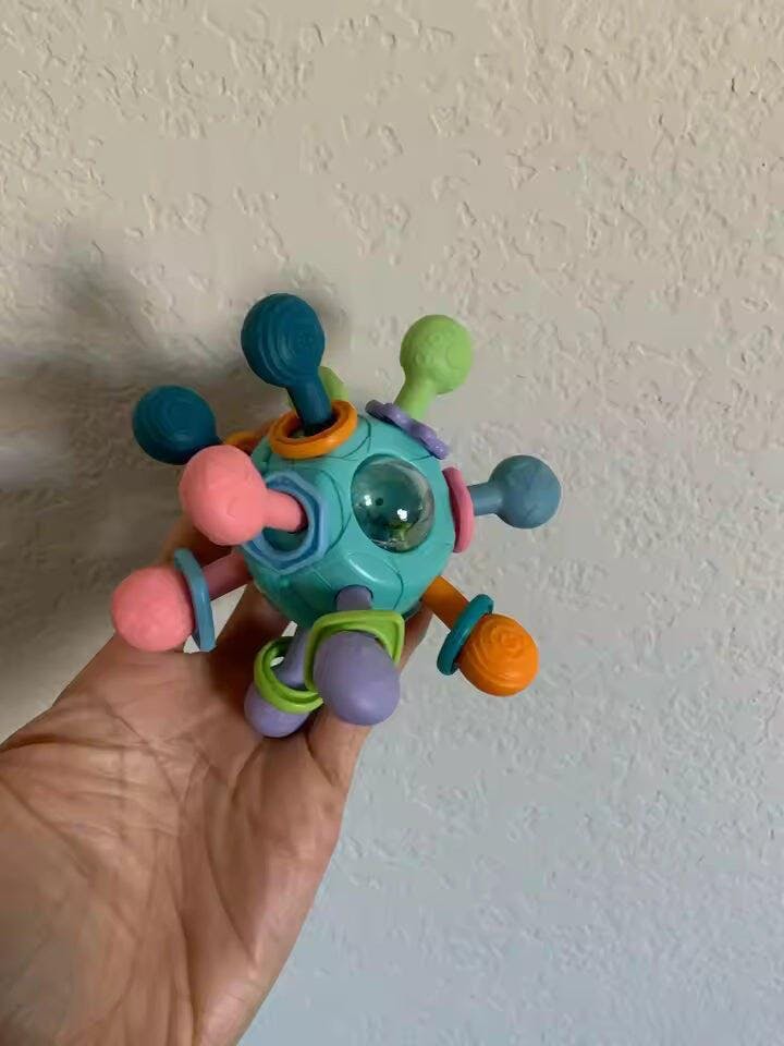 La palla sensoriale ha catturato subito l’attenzione del mio bambino, adoriamo il suono del sonaglio. È facile da impugnare e il silicone è morbido sulle gengive.