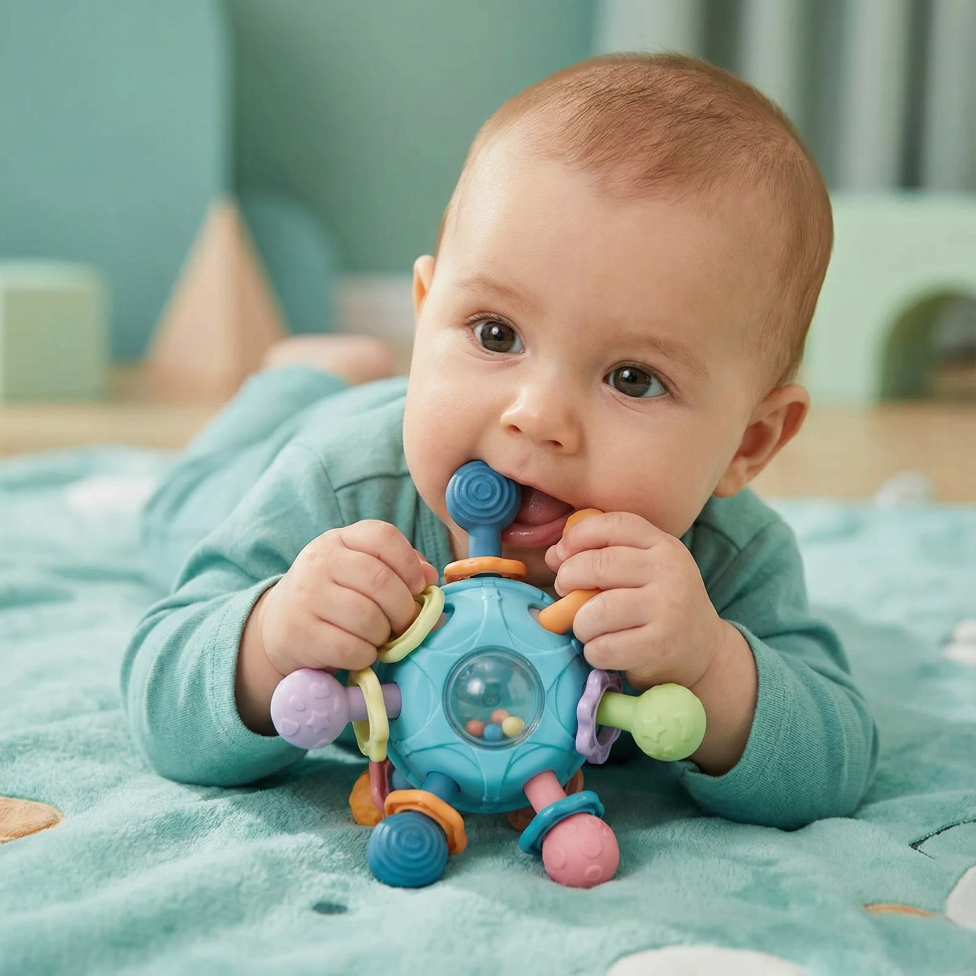 Palla sensoriale per neonati con anello da dentizione in silicone e sonaglio