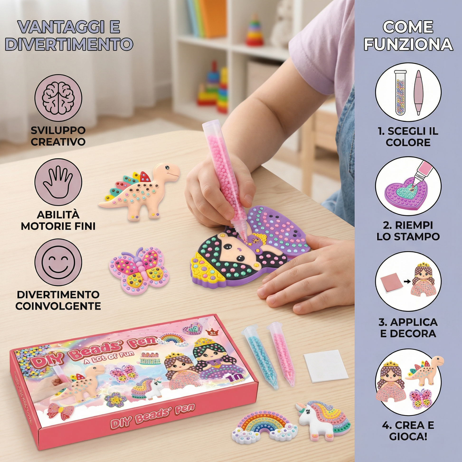 - 🧠 Rafforza concentrazione e pazienza – posizionare le perline con precisione aiuta i bambini a sviluppare perseveranza e un modo di lavorare calmo e attento.
